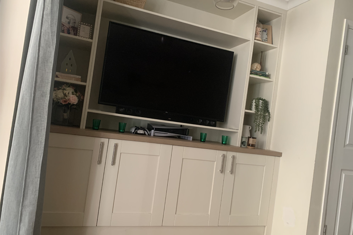 For the first case study, we built a custom media unit from scratch, featuring a flawless spray finish, oak worktops, and spacious cabinets. This unit was designed to maximise storage while complementing the room’s decor. The second case study involved constructing a media wall, which was plastered and decorated to perfection. The design included an integrated TV, soundbar, and discreet access panels for cable management, ensuring a sleek and seamless appearance. Both projects demonstrate our commitment to delivering high-quality craftsmanship and tailored solutions that enhance the functionality and style of our clients’ homes.