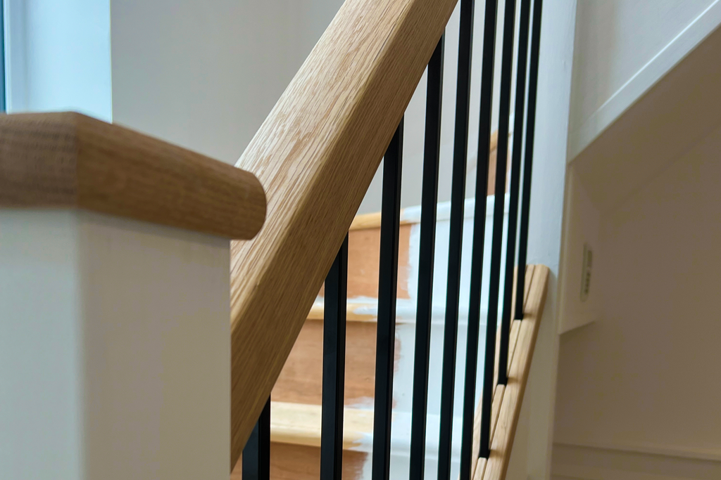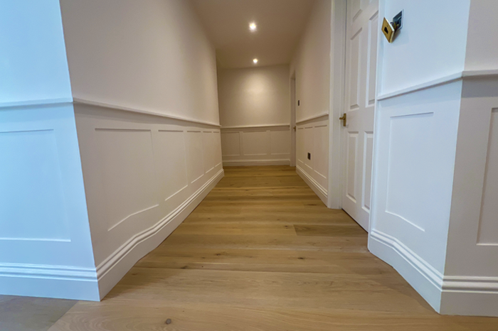 We began by panelling the entirety of the first and second floors, creating a sophisticated and unified look. New skirting boards were installed upstairs and downstairs to complement the design. A custom media wall was built to integrate a TV seamlessly into the living space, combining style and functionality. We installed new internal doors throughout the house, enhancing both privacy and decor. A stunning oak staircase with black spindles was crafted to serve as a centrepiece, and bespoke panelling in the master bedroom added a touch of luxury. To complete the transformation, the entire house was redecorated to achieve a flawless finish. This comprehensive renovation highlights our commitment to delivering tailored solutions that elevate our clients’ homes.