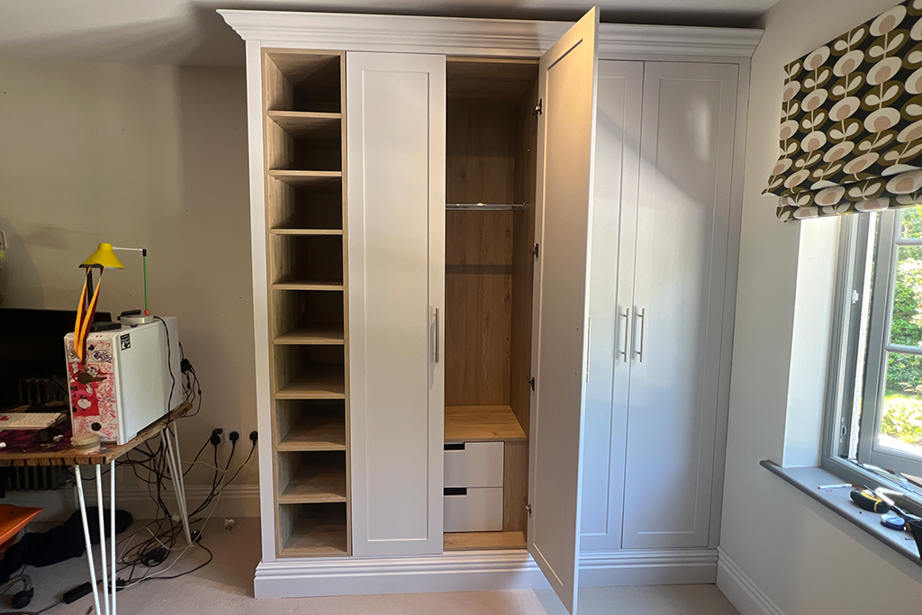 To achieve this, we created two bespoke wardrobes featuring classic shaker-style doors and a flawless custom spray-painted finish. The internals were crafted from honey oak, adding a warm and luxurious feel. Adjustable shelving and hanging rails were integrated into the design to ensure maximum versatility, and two spacious storage compartments provided additional practicality. The combination of expert craftsmanship and premium materials resulted in a wardrobe solution that was both beautiful and functional.